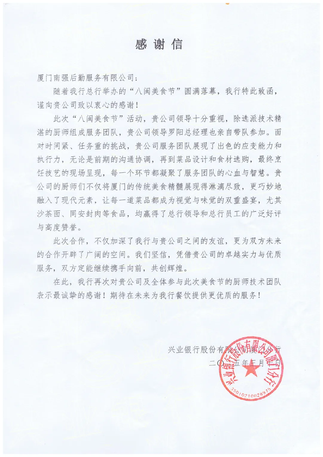 兴业银行厦门分行给公司发来感谢信